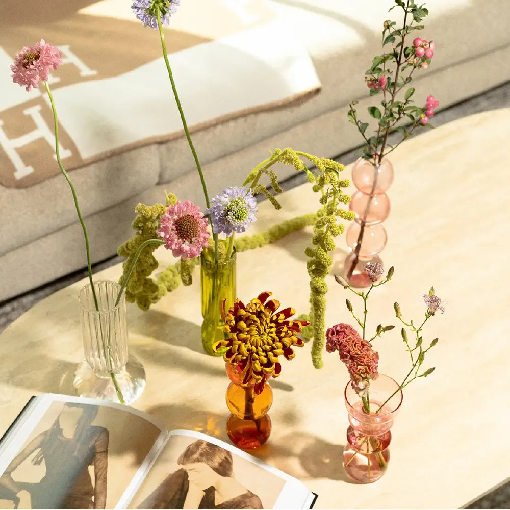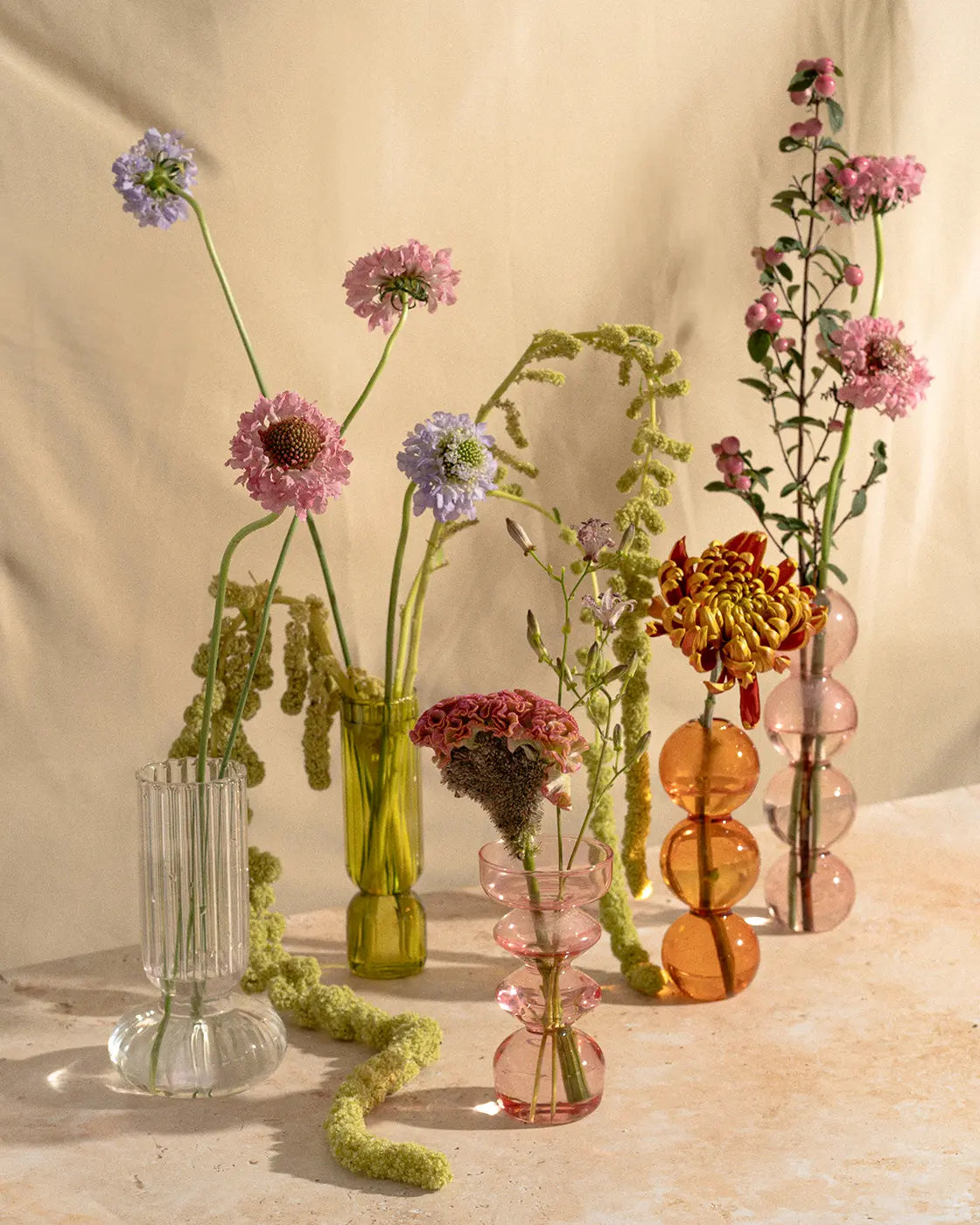 Experience the delight of our weekly Subscription with a burst of vibrant beauty with five hand-blown glass vases filled with fresh flowers every week.