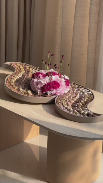 Elevate every occasion with Lunar Harmony Flowers and Chocolates, a crescent-shaped masterpiece that unites celestial elegance with refined taste. Designed in a sculptural crescent form, this tray showcases a lush arrangement of premium seasonal blooms paired with a curated selection of gourmet chocolates and delicacies from Ananas Chocolatier.