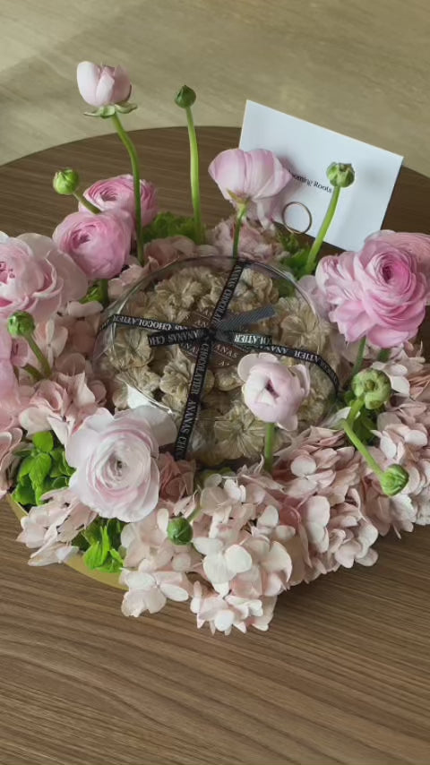 Indulge in elegance with this exquisite round gold tray, beautifully adorned with delicate pink and green hydrangeas and elegant pink ranunculus flowers, creating a sophisticated floral arrangement. At the heart of this luxurious display sits a crystal-clear glass bowl, filled with 700Grams of premium mixed chocolates from Ananas Chocolatiers—a delightful assortment of rich, handcrafted treats perfect for any occasion.